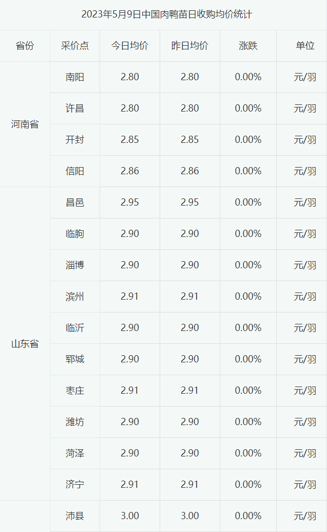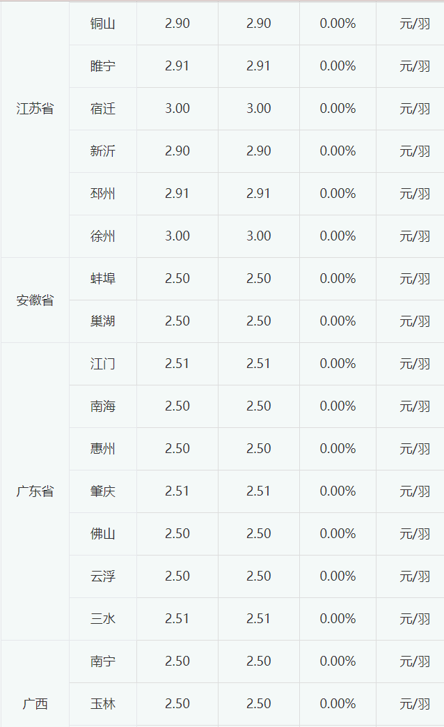 今日全国主流市场白羽肉鸭苗价格暂时企稳。当前鸭苗出苗量继续增加,供应仍保持宽松态势,而排苗计划一般,养户多观望。预计短期鸭苗价格或会小幅震荡。今日全国主流市场白羽肉鸭苗销售批发均价2.75元/羽,较昨日持平。今日全国部分地区白羽肉鸭苗报价如下: