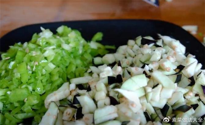 3.切好青椒后,再把茄子切成小丁,青椒和茄子搭配起来特别的好吃,没有尝试过的朋友一定要试一试,这些材料都切好了,咱们把它盛起来一会儿去炒一炒。