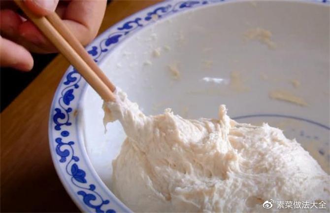 1.先放上400g的面粉,4g的酵母粉,接下来用280毫升的的温水和面,这一次的含水量特别的大,大家要把握好这个水量,这次咱们直接不用揉面了,一直搅拌成这样粘稠的糊状就行了,上面盖上一层案板或者保鲜膜,去发酵大概有45分钟的时间。