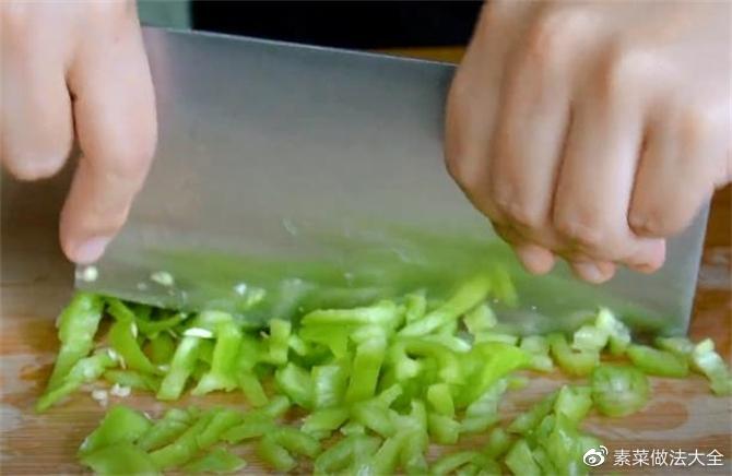 2.面快发好的时候,咱们准备上青椒和茄子,切好之后咱们把青椒剁碎一些。