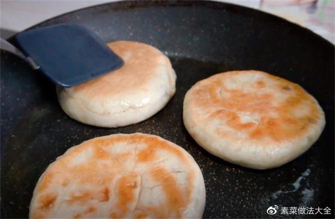 8.平底锅中小火把锅预热好之后刷油,多刷一些油,这样烙的颜色好看一些,放饼胚,盖上盖子烙,大概有一分钟,饼皮鼓起了,底面也稍微有点变色了,咱们表面刷一点油,翻个面,盖上盖子继续烙,中间再翻一次面,一直烙到两面金黄,按压能快速回弹,咱们这个饼就熟了,出锅。