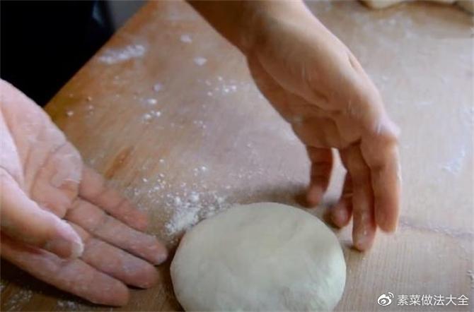 6.把每个面剂都按扁,面团特别软,咱们直接用手按成中间厚四周薄的饼皮,中间包上馅,一定要把这个收口处给封紧了。