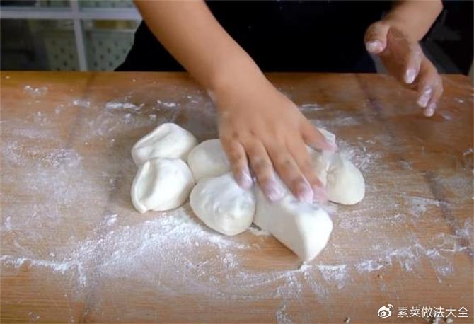 5.现在面发好了,咱们简单的处理一下,表面多撒一些干面粉,揉一揉排气,排气好了之后滚成长条,然后就可以开始切面剂了,我一共切了9个面剂,包这些馅刚刚好。