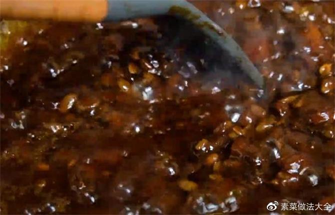 6.咱们开始加点甜面酱,我这些甜面酱大概有150g,再准备一些豆豉,把豆豉放进去,一般这个豆豉在超市就能买到,熬酱的时候一定要多搅拌,这个加了甜面酱特别容易糊锅,一直熬到较粘稠就可以了。