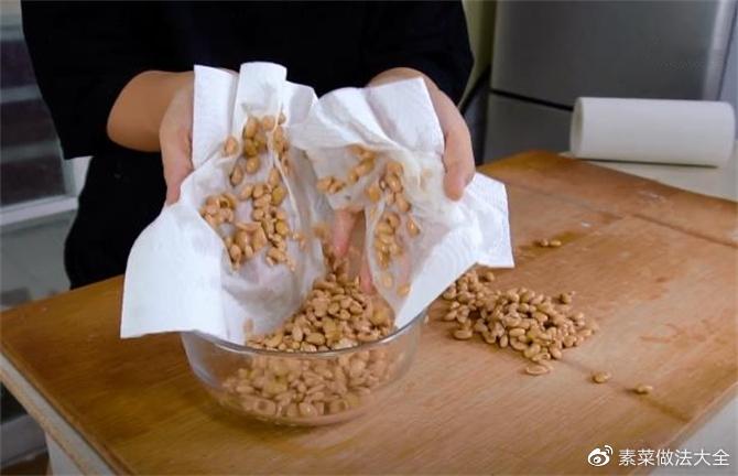 3.大概炖了有40分钟,咱们的豆子煮好了,把它盛出来,再准备一些厨房纸,把豆子表面的水分吸一下,这样炸的时候就不会崩油了,吸好水分之后,再把它盛到碗里面。