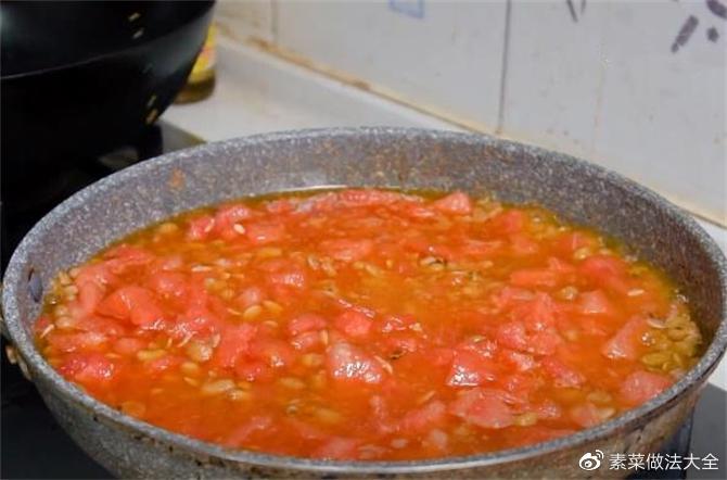 5.我们把满满一大盆西瓜放进去,喜欢吃甜的朋友们可以多放一点西瓜,用铲子捣一捣把西瓜捣碎,现在西瓜已经煮出来大部分的水分了。