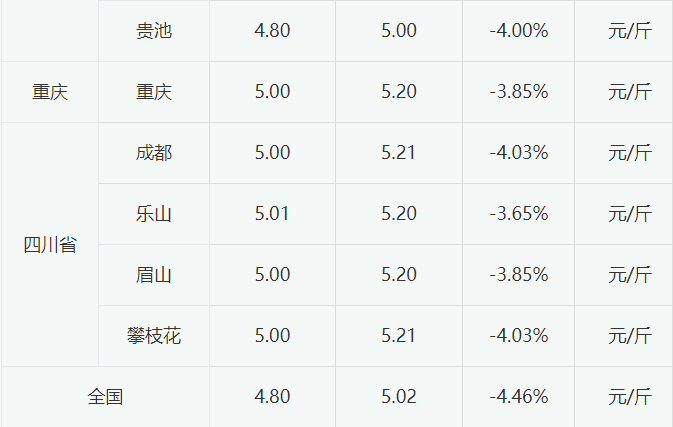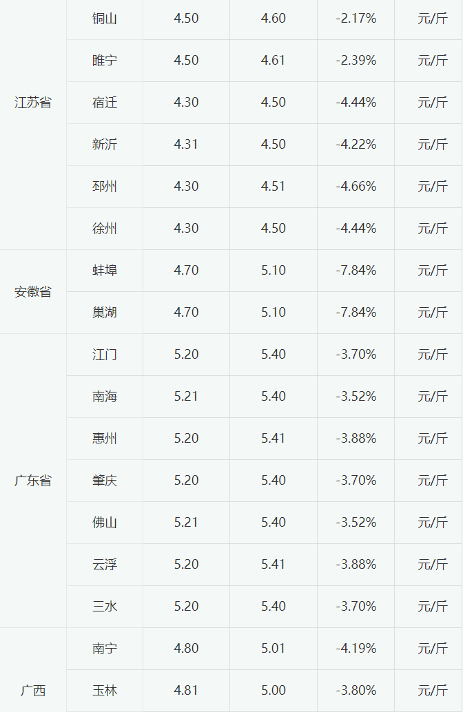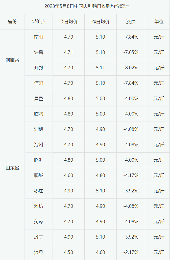 今日全国主流市场白羽肉毛鸭价格明显下调。当前毛鸭市场产能缓慢释放,供应量继续小幅增加,冻品市场显弱,屠宰端长时间亏损,为控制成本和经营风险,对毛鸭的需求较淡。预计短期毛鸭价格或将小幅震荡。今日全国主流市场白羽肉毛鸭销售批发均价4.80元/斤,较昨日跌0.22。今日全国部分地区白羽肉毛鸭报价如下: