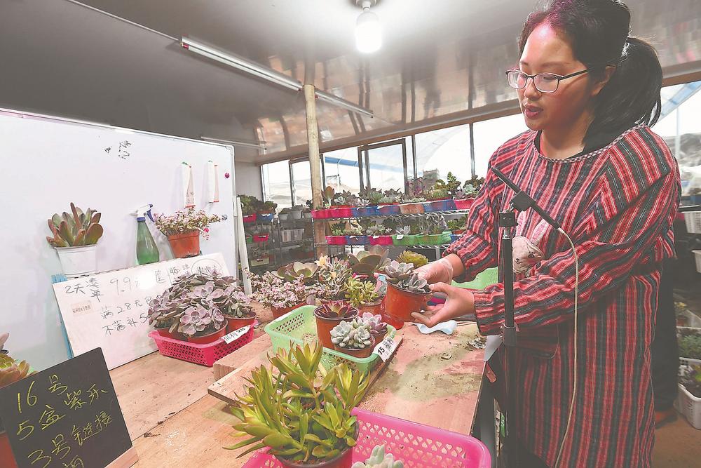 李萍周围,能把人看花眼的多肉盆栽成排成簇地摆放在展示架上。大棚入口处,几名女工将顾客下单的多肉去盆、去土,等风干到半脱水状态,再裹上棉花、装进纸箱。这些小可爱将通过四通八达的物流网络,送到天南海北的多肉爱好者手上。