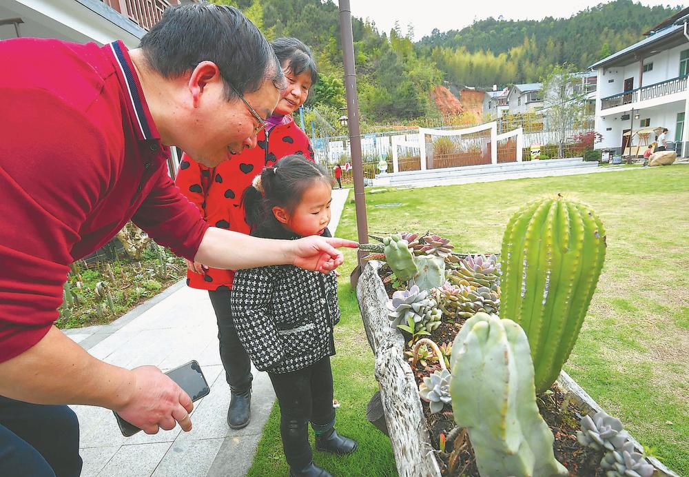 乐野小镇上,小朋友饶有兴趣地学着辨认多肉植物。