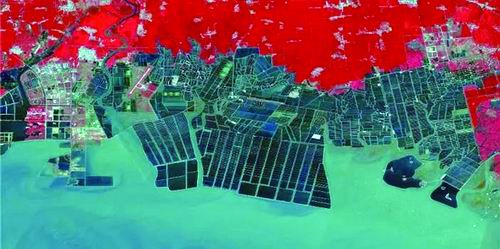 用遥感拍摄的辽宁省盘锦市海岸边的农田与养殖池,在假彩色遥感影像中得以区分,红色区域为长有植被的农田。俞乐课题组/摄