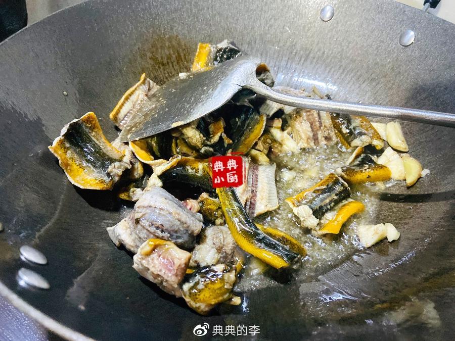 记住黄鳝一定要大火烧,这样才能保证口感和味道,翻炒至黄鳝段变色且呈现卷曲状态。