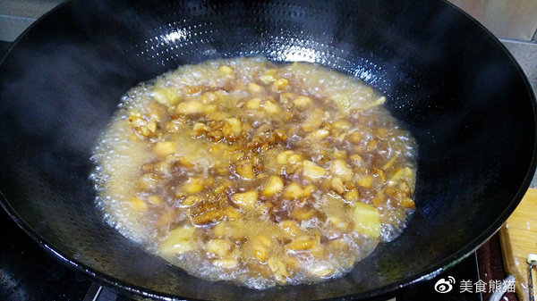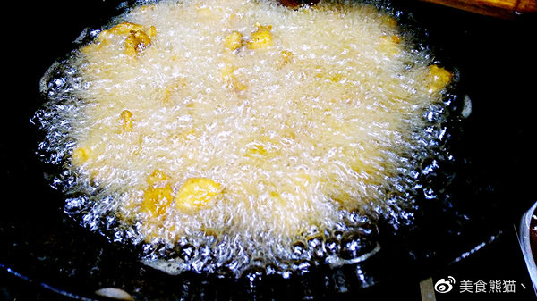 5、锅放油,油温约5成热,放入腌好的鸡腿肉,轻轻划开,炸至金黄色捞出。