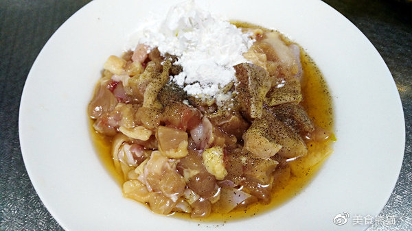 3、鸡腿肉用适量盐、生抽、胡椒粉、黄酒、淀粉抓匀,腌制10分钟后,加少许油拌匀。