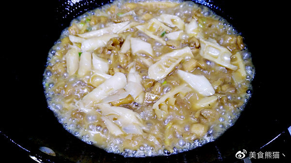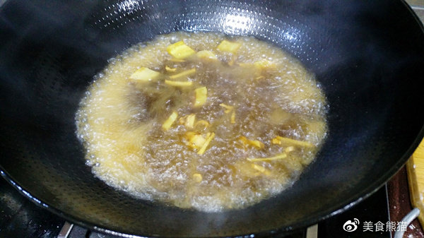 6、锅底留少量油,小火下葱姜丝炒香,依次加蚝油、生抽、黄酒、适量水。