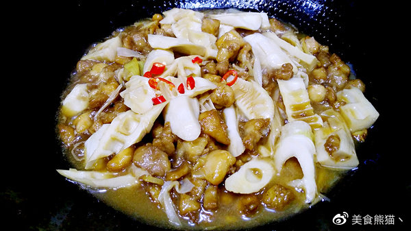 7.将炸好的鸡肉倒入锅中,烧制5分钟后,放入竹笋一起再烧15分钟,加盐调味,最后撒上小米椒、香葱,即可出锅装盘享用。