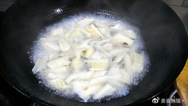 4、竹笋切小块,用开水焯一下。参考:竹笋去除苦涩味的方法。