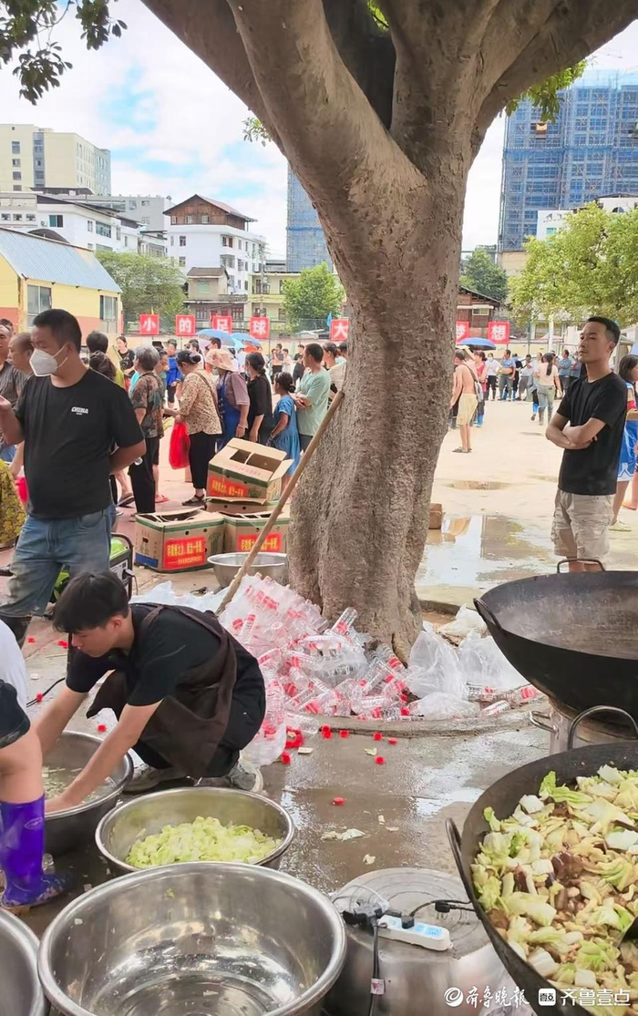7月2日中午,“战地厨房”正式开火。没有自来水,就用捐赠的矿泉水做饭;没有电力,就启动临时发电机保障炉灶运转。周天增带着团队做的第一顿饭是红烧肉炖白菜粉条,“800人的饭菜,两三个小时就做好了。”从事农村大席十几年的周天增对此得心应手,他曾最多同时为1万多人备餐。