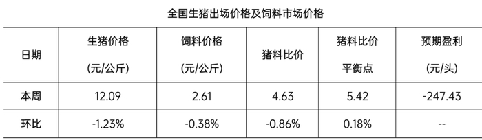 本周全国猪料比价为4.63,环比下跌0.86%。按目前价格及成本推算,未来仔猪育肥模式的生猪养殖头均亏损为247.43元。本周生猪均价环比下滑。