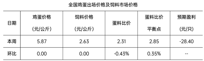 本周全国蛋料比价为2.31,环比下降0.43%。按目前价格及成本推算,未来蛋鸡养殖每只亏损28.40元。