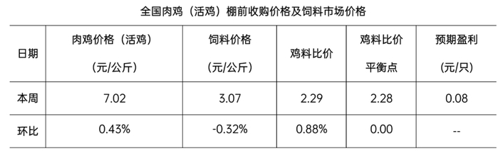 本周全国鸡料比价为2.29,环比上涨0.88%。按目前价格及成本推算,未来肉鸡养殖预期每只盈利0.08元。