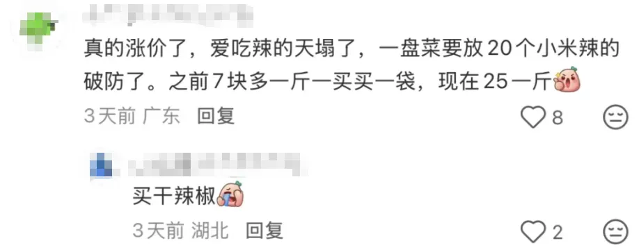 “一斤小米辣顶两斤猪肉了。”市民告诉记者,“现在随便抓一把就要七八块,做菜都要省着点用了!”