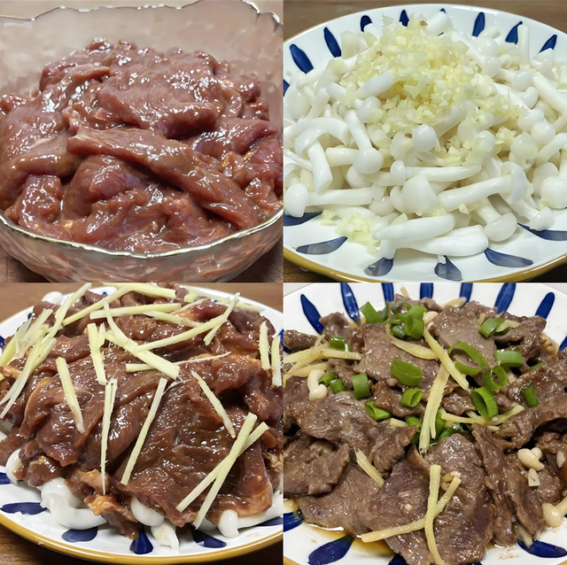3. 将腌制好的牛肉片铺在白玉菇上,再放上一些姜丝。