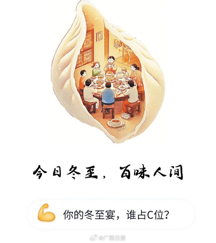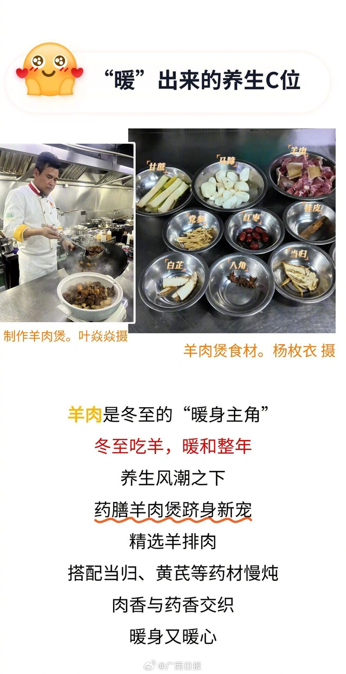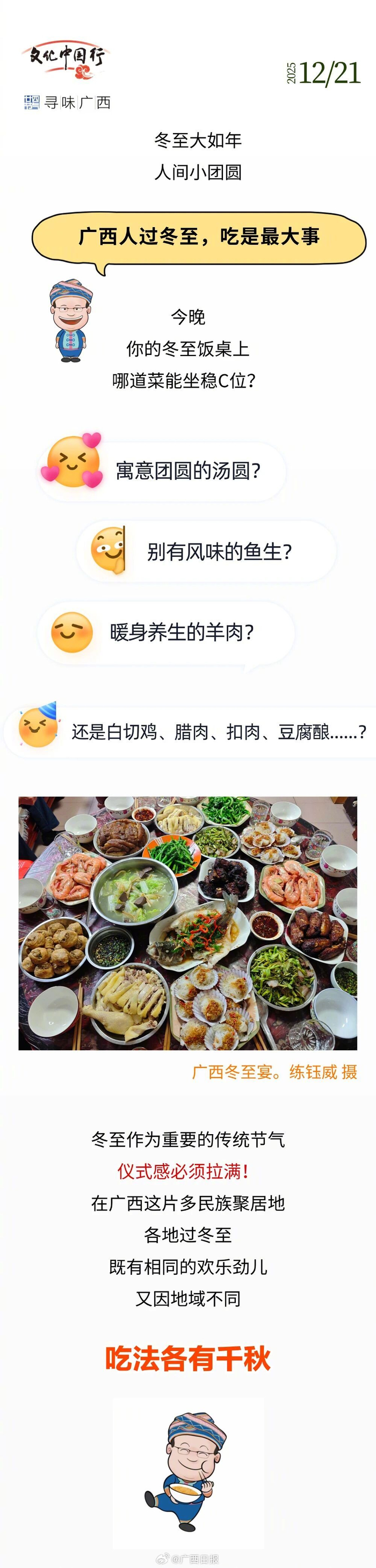 广西人过#冬至#,吃是最大事。冬至作为重要的传统节气 ,仪式感必须拉满!白切鸡、鱼生、羊肉、腊肉、糍粑……在广西这片多民族聚居地,各地过冬至吃法各有千秋,一起来看看↓#今日23时03分冬至##二十四节气寻味广西#(来源:广西日报农业部、创意工作室) #广西人冬至味蕾仪式感#