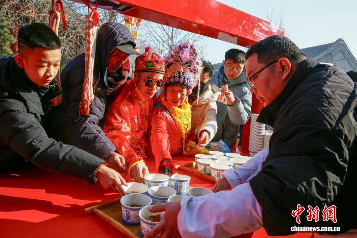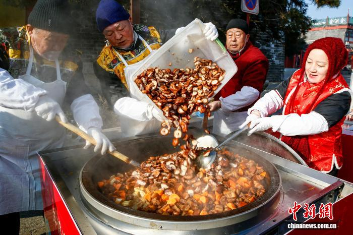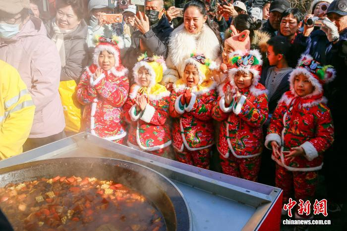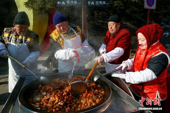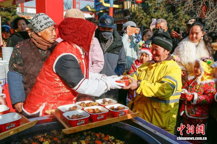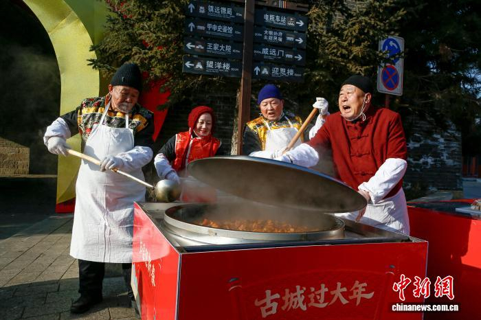 2月13日,农历腊月二十六,河北省秦皇岛市山海关古城炖年肉活动现场格外热闹,工作人员将炖熟的年肉免费赠送给民众品尝,寓意新的一年红红火火。“腊月二十六 ,杀猪割年肉”,民间俗语说的是,新年将至,年味愈浓,腊月二十六这一天,家家户户要筹备过年的肉食,故称为“年肉”。图为炖年肉活动现场。孙航 摄